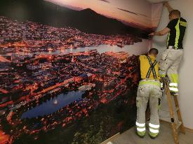 På bildet monterer vi fototapet som er 8 meter lang og 3 meter høy.